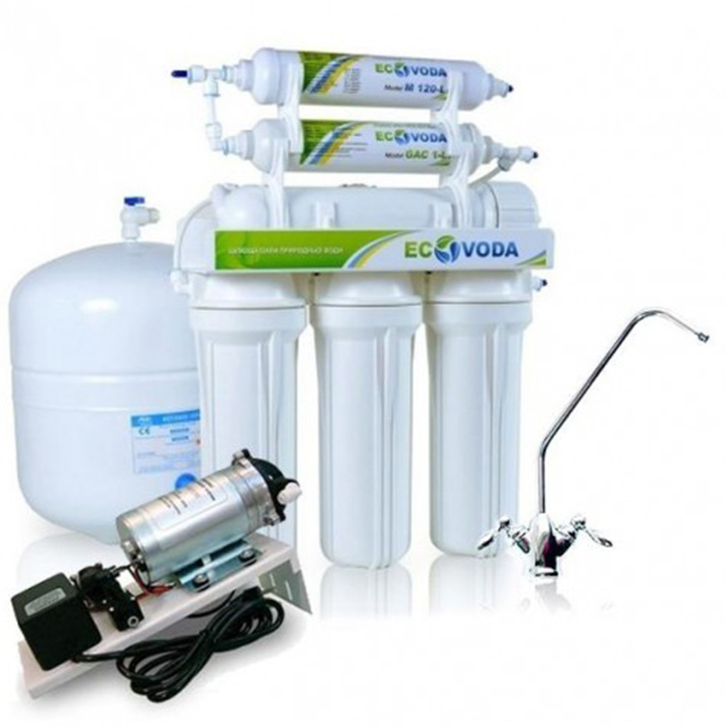 Зворотний осмос з мінералізатором і насосом Эковода RO-6P - недорога система очищення води, яка ідеально підійде для квартири і приватному будинку. Це побутовий фільтр, який монтується під мийку і має окремий кран чистої води і накопичувальну ємність, яка зберігає чисту воду. Фільтр з мінералізатором має подвійний кран чистої води. Один з важелів подає воду після мембрани зворотного осмосу, яка без мінералів, а інший вентиль подає воду після насичення мінералами.